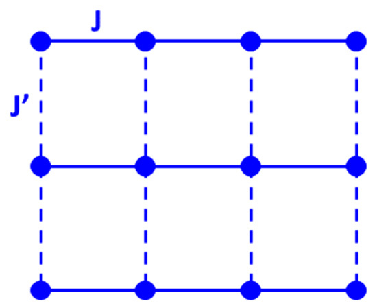 The absence of the Néel order in the ground state is believed to be a general feature of one-dimensional isotropic antiferromagnets [17,18,41]. Inter-chain coupling can change the ground-state properties and introduce dimensional crossover phenomena. A two-dimensional array of the spin chains coupled by the inter-chain interaction as depicted in Figure 3, forms a spatially anisotropic square lattice, often called as a rectangular lattice, which can be described by the Hamiltonian