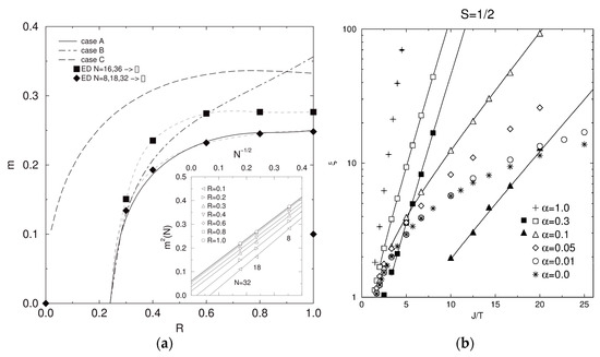 (a) Ground-state staggered magnetization m of the rectangular lattice for different R values calculated by various approaches; the short-dashed lines are fits to the exact diagonalization (ED) data. Cases A, B, C correspond to different choice of parameters in Green’s function approach. The inset demonstrates the deviation of the ED results from the N-1/2 scaling law at R < 0.3 (solid lines are least-squares fits). (Reproduced with permission from reference [72]); (b) The correlation length for the S = 1/2 HAF on the rectangular lattice as a function of the inverse temperature for various R values (α stands for R). Open (filled) symbols denote the correlation length along (perpendicular to) the chain. For small α (α < 0.05), the values of inter-chain correlation length are smaller than one lattice constant and are not shown in the figure. Solid lines are fits to Equation (5), showing the exponential dependence of ξ on 1/T. (Reproduced with permission from reference [75]).