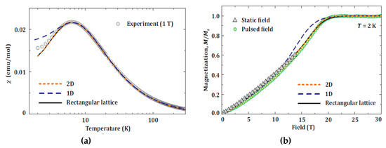 Similarly, it was shown in reference [79], that the susceptibility and isothermal magnetization of Cu(PM)(EA)2 (PM = [C6H2(COO)4]4−, EA = [C2H5NH3]+) can be described by the model (Equation (4)) with various R in a wide range of temperatures and magnetic fields (Figure 5).