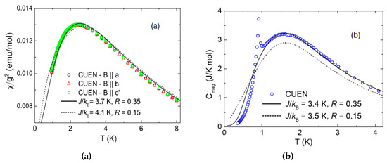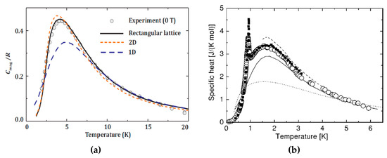 (a) Fits of the magnetic specific heat of Cu(PM)(EA)2 in B = 0 with the model (Equation (4)) for R = 0 (1D), R = 1 (2D) and R = 0.7 (rectangular lattice) with the same parameters as in Figure 5. (Reproduced with permission from reference [79]); (b) Fits of the magnetic specific heat of Cu(en)(H2O)2SO4 in B = 0 (open and full circles correspond to powder and single crystal, respectively) with the model (Equation (4)) for R = 0 with J/kB = 3.6 K, (solid line), R = 1 with J/kB = 2.8 K (dashed line) and the model of the S = 1/2 HAF on the triangular lattice with J/kB = 4.4 K (dotted line). (Reproduced with permission from reference [65]).