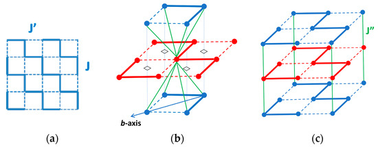 On the other hand, the strength of the inter-layer coupling in Cu(en)(H2O)2SO4 was estimated to be much lower than 0.015 J [82] thus, according to reference [87], no phase transition should be visible in the specific heat data. In Cu(en)(H2O)2SO4, the adjacent layers are shifted along the b-axis by b/2. As a consequence, a central spin from the magnetic layer has a high number of nearest neighbors (z = 8) from the adjacent layers (Figure 7). It should be noted, that QMC simulations [87] were performed for the geometry of the simple cubic lattice, thus only z = 2 was considered for the central spins in the layer.