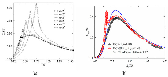 (a) The specific heat of the S = 1/2 HAF model on the spatially anisotropic simple cubic lattice with R = 1 within the layers. Quantum Monte Carlo calculations are performed over a wide temperature range for several different spatial anisotropies (α = J″/J). The system size is 48 × 48 × 12. The separation of the 3D ordering peak from the broad maximum arising from the 2D physics is clearly visible for α < 2−3. (Reproduced with permission from reference [87]); (b) Temperature dependence of Cu(en)(H2O)2SO4 (J/kB = 2.8 K) and Cu(tn)Cl2 (J/kB = 3.1 K) magnetic specific heat compared with the theoretical prediction for the S = 1/2 HAF on the square lattice (R = 1).