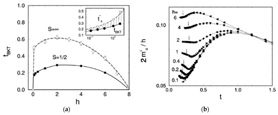 On the other hand, the average projection of the spins in the xy plane decreases, the system behaves as a planar rotator with a reduced rotator length, which leads to the reduction of TBKT. The effective rotator length goes to zero at the saturation field and corresponding BKT critical temperature vanishes. Apparently, the interplay between the two effects is responsible for the non-monotonous dependence of TBKT, which for the S = 1/2 achieves maximum values at higher fields than in the classical counterpart (Figure 11a). This shift was ascribed to the effect of quantum fluctuations [106].