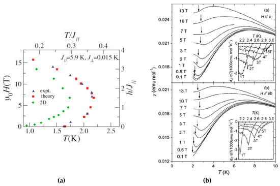 with the parameter C = 160 and ρs = 0.214 J. The onset of the XY regime below TCO is accompanied with the formation of the pairs of vortices and antivortices. Concerning the specific heat, a position of a tiny peak superimposed on the left side of a round maximum, corresponds to the maximum of the temperature derivative of the vortex density, while a phase transition of Berezinskii–Kosterlitz–Thouless type is set at lower temperature. For = 2 × 10−2, the uniform susceptibility follows the behavior of the HAF on the square lattice down to 0.4J. At lower temperatures, the transverse and longitudinal susceptibility separate from the isotropic Heisenberg curve well above the transition temperature, TBKT; at TCO, the χzz component displays a minimum, while χxx decreases faster than the isotropic Heisenberg curve, achieving some nonzero value at T = 0. As authors showed, in the experiments with the real quasi-2D quantum magnets, the measurements of a single-crystal uniform susceptibility can help to determine the onset of a phase transition as well as the type of the spin anisotropy. If a minimum in the χzz component is observed above TN (i.e., the temperature of a phase transition to the 3D LRO), this is a signature of the easy-plane anisotropy, while the occurrence of the minimum at the transition temperature suggests the easy-axis anisotropy (Figure 10a).