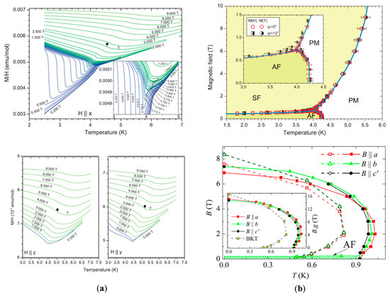 In Cu(pz)2(ClO4)2, for the field applied along the easy axis, the AF-SF critical line ended in a bicritical point at 4 K and the field about 0.73 T (Figure 13). For the constant fields B < 0.5 T, the temperature dependence of the corresponding normalized uniform magnetization M(T)/B is characterized by a sharp change of the slope in the vicinity of the transition temperature, separating the collinear AF Néel phase and the paramagnetic (PM) phase. For the fields, 0.5 < B < 0.73 T, the M(T)/B curves cross the SF-AF and AF-PM critical lines. The former crossing is accompanied with a pronounced step in the curves (Figure 13a). For higher fields, the spin-flop phase is stabilized with the XY regime, manifesting by the upturn in the M(T)/B curves with a minimum, ascribed to the 2D Heisenberg-XY crossover. The kinks in the curves were associated with the onset of the 3D LRO. The application of the field along the hard axis z, leads to the behavior of M(T)/B typical for the XY regime, since the magnetic field enforces the effect of the intrinsic easy-plane anisotropy, resulting in the effective easy-plane anisotropy [94]. Concerning the middle axis y, authors of reference [16] expected enforcing of the in-plane easy-axis anisotropy, . However, as was shown in Cu(pz)2(ClO4)2, in this orientation, the fields above 2 T introduced the XY regime with the effective anisotropy (Figure 16 in reference [94]). Apparently, alike in the case of the aforementioned easy-plane XXZ model, the theoretical studies of the S = 1/2 2D XYZ model on the square lattice with a weak spin anisotropy are necessary, to verify the persistence of the Ising-like ground state as well as the Ising-XY crossover, induced by the field applied along the middle axis.