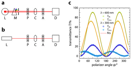 At a given wavelength, the polarizer angle was scanned from 10 to 330 in steps of 0.15 and the light intensity transmitted through polarizer (P), crystal (C), and analyzer (A) was recorded for 0.2 s at each step. Then, the crystal was removed from the beam path and the scan was repeated to measure the light intensity transmitted through polarizer and analyzer only. Transmitted light intensities were recorded as transmittances relative to a reference beam path and were corrected for the inherent polarization of the incident beam and potential polarization-dependent sensitivities of the detectors using an additional polarization scan with only the polarizer in the beam path (). Observed transmittances were corrected as follows: