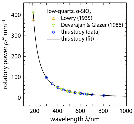 The constant A captures the strength of dispersion, while is the wavelength of an optically active electronic transition [39]. While more elaborate formulations for the optical rotatory dispersion of low-quartz have been proposed [45,46,47], we found the simple expression (6) to accurately describe our experimental data within their uncertainties. By fitting Equation (6) to our experimental results, we obtained 7.17(3) mm and 129(1) nm. Inter- and extrapolating our results using these parameters in the dispersion relation (6) gave excellent agreement with literature data on the rotatory power of low-quartz, even at wavelengths in the deep UV where the rotatory power is strongly affected by dispersion and outside the spectral range accessible with the spectrophotometer (Figure 2). This result demonstrates the accuracy of our method to determine the rotatory power at different wavelengths using a spectrophotometer.