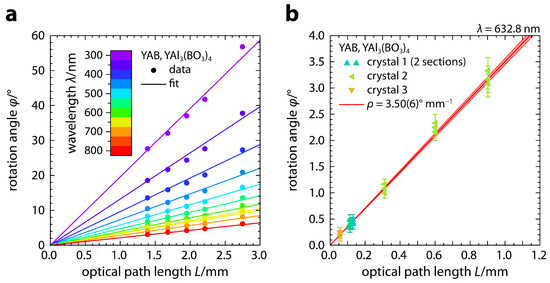 Figure 3a shows the measured optical rotation angles for different wavelengths as a function of the optical path length L. For a given wavelength, the observed rotation angles display a linear relation with the optical path length. In particular, the highest rotation angles are observed for the longest optical path lengths. These observations suggest that the probed crystal volume was composed of a single domain and that the observed rotation angles were not affected by lamellae of inversion twins. To extract the dispersion relation of the rotatory power of YAB, we analyzed the complete data set of pairs of rotation angles and optical path lengths L using a modified version of Equation (6):