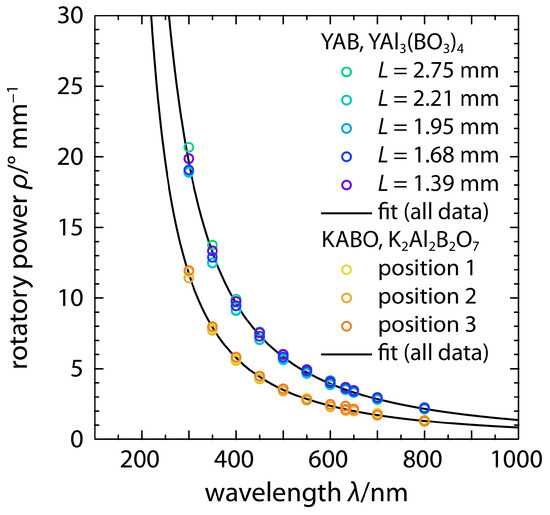Optical rotatory dispersion of YAB (YAl(BO)) and KABO (KAlBO). For YAB, rotatory powers were measured on the same domain for five different optical path lengths (see also Figure 3a). For KABO, rotatory powers were measured at three different locations on the same crystal section.