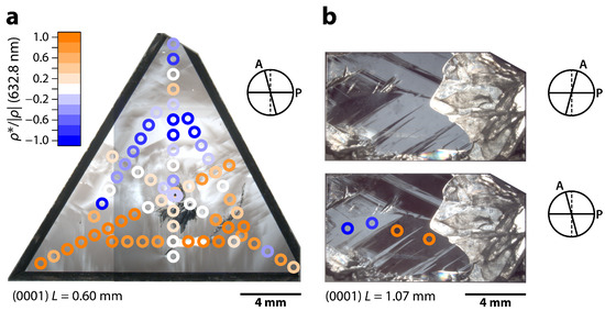 To demonstrate that the contrast between domains in the images indeed arises from opposing signs of optical activity, we measured the apparent rotatory power at different locations on the crystal sections using the setup with the He-Ne laser (Section 2.3 and Figure 1b). The results are superimposed on the images as the color-coded ratio of apparent to intrinsic rotatory power at a wavelength of 632.8 nm. A spatial correlation exists both between domains in extinction (dark) and positive apparent rotatory powers (orange) and between bright regions and negative apparent rotatory powers (blue). Changes in sign of the apparent rotatory power across the crystal sections demonstrate the presence of right- and left-handed domains within individual YAB and KABO crystals. As proposed for YAB [18,21], we interpret these domains as inversion twins and note, to the best of our knowledge, that inversion twins have not previously been detected in KABO crystals.