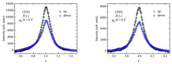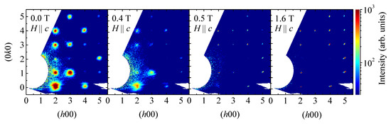 By 0.8 T, the rods split into “spots”, for example at () and (), and symmetry related positions, as shown in the right panel of Figure 5. This scattering pattern for the up–up–down spin state is also visible in 1.0 T; however, by 1.2 T, the diffuse “spots” have lost some intensity. Figure 6 shows the cuts through () in three fields along the l-direction. Upon increasing the applied field above 1.2 T (not shown), all of the diffuse scattering disappears and only intense new Bragg peaks are measurable in both the Z NSF and Z SF datasets. For example, in the 2.0 T dataset shown in Figure 5, a new Bragg spot at (400) appears in the Z NSF measurement. Overall, there is good correlation between what was seen in the neutron scattering pattern and the critical field positions that were expected from bulk magnetisation measurements for the field applied along the b-axis of SrHoO [5]. It should be noted that, for the diffuse scattering intensity due to the type structure (seen in the Z SF channel), there is relatively little difference in the scattering pattern for all applied fields compared to zero field measurements.