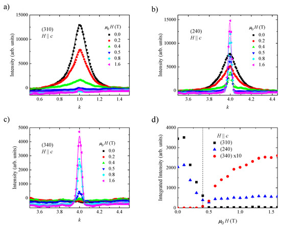 Datasets to illustrate the field evolution of the magnetic scattering intensity for different reflections in the plane are presented in Figure 3a–c. Reflections such as (310) lose all of their diffuse intensity upon increasing the field up to 0.5 T, and subsequent increases of the applied field do not change their magnitude; see Figure 3a. The diffuse scattering is suppressed by a field of 0.5 T for a lot of the magnetic reflections, with peaks such as (240) shown in Figure 3b initially losing intensity, but then developing strong (and likely ferromagnetic) components. Reflections such as (340), whose field dependence is shown in Figure 3c, did not have any diffuse magnetic intensity in zero field, and only develop Bragg intensities in applied fields above 0.4 T. The intensities of the new Bragg peaks that are stabilised by an applied field do not saturate, so it can be assumed that the spins are not yet completely aligned by the field. From magnetisation measurements, it is clear that the saturation value for is above 7 T (the highest applied field that SrHoO has been measured in). Throughout, the diffuse scattering features have been fit using a Lorentzian distribution, and the ferromagnetic peaks have been fit using a Gaussian distribution. From the fits to the data, it can be seen that the Lorentzian component decreases, and the correlation lengths associated with the diffuse scattering features go to zero (not shown). The field dependence of the magnitude of the integrated magnetic intensity for the different reflections is summarised in the bottom left panel of Figure 3.
