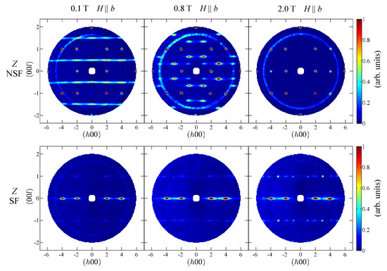 From the lowest temperature magnetisation measurements on a single crystal SrHoO sample, it is conjectured that an up–up–down collinear spin state appears to be stabilised when a field of around 0.8 T is applied along the b-axis [5]. This state can be inferred from the location of the plateau observed in , a minimum in , at a third of the value expected for the fully saturated moment. Thus, in order to investigate the field induced changes to the one-dimensional diffraction pattern from SrHoO, polarised neutron scattering measurements were performed using the D7 instrument [18,19,20]. The polarised neutron experiments were configured to measure two independent components of the scattering function, here called the non-spin-flip and spin-flip channels. The Z polarisation direction in our measurements is normal to the scattering plane, and hence the sum of Z NSF and Z SF measurements is what would be observed in unpolarised neutron experiments. The field was applied along the b-axis (which also coincides with the Z polarisation direction) and the scattering in the plane was measured at 125 mK in the magnetic field range of 0.1 to 2.0 T. The top and bottom panels of Figure 5 show the scattering intensity in the Z polarised NSF and SF channels in applied fields of 0.1, 0.8 and 2.0 T. The background that can be attributed to scattering from the cryomagnet, dilution fridge and the copper sample holders used in the experiment was measured in 0.1 T. The background correction appears to work less well for higher scattering vectors, which means that there are some residual powder lines from the copper in the diffraction patterns in Figure 5.