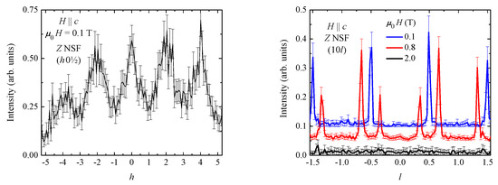 As in the zero field measurements, in low applied fields of 0.1, 0.3 and 0.6 T, there are rods of scattering intensity at and symmetry related positions in the Z NSF measurement. The experiment is directly comparable to the zero-field data—the only difference is that this time the sample has been FC and the data collected in a small field of 0.1 T. Thus, the structure of the magnetic scattering is similar—again the pronounced Q-dependence to the scattering intensity, where maxima of intensity occurring near the integer values of h can be seen, as shown in the left panel of Figure 6, but the magnetic scattering is not as intense as in the zero field pattern. No extra magnetic features due to the () planes are observed in the spin–flip channel, and only the diffuse scattering intensity along () is clearly visible in the measurements, which is due to the k = 0 type structure.