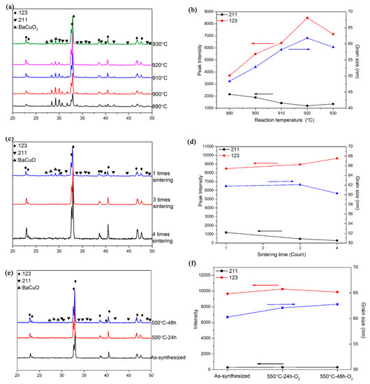 (a) phase formation of Er123 sintered by different temperature for 24 h; (b) Peak intensity and grain size from the XRD results of Er123 sintered by different temperature for 24 h; (c) phase formation of Er123 sintered at 920 °C for 24 h by multiple times; (d) Peak intensity and grain size from the XRD results of Er123 sintered at 920 °C for 24 by multiple times; (e) phase formation of Er123 with oxygen annealing at 500 °C for 24~48 h; (f) Peak intensity and grain size from the XRD results of Er123 with oxygen annealing at 500 °C for 24~48 h.