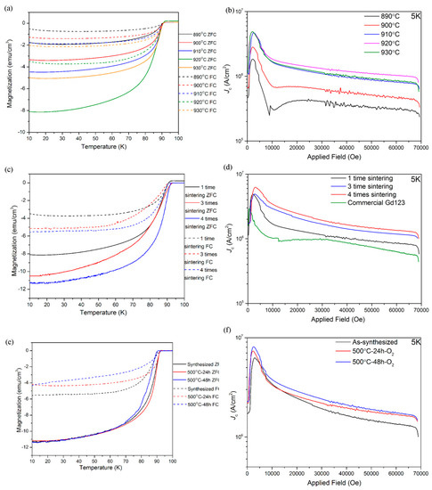 (a) ZFC and FC curves of the Er123 sintered by different temperature for 24 h; (b) Jc vs B curve at 5 K of the Er123 sintered by different temperature for 24 h; (c) ZFC and FC curves of the Er123 sintered at 920 °C for 24 h by multiple times; (d) Jc vs B curve at 5 K of the Er123 sintered at 920 °C for 24 h by multiple times; (e) ZFC and FC curves of the Er123 with oxygen annealing at 500 °C for 24~48 h; (f) Jc vs B curve at 5 K of the Er123 with oxygen annealing at 500 °C for 24~48 h.