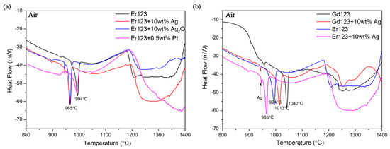 (a) The DTA results of Er123 powder with different dopants; (b) The DTA results of Er123 and Gd123 powder with and without Ag doping.