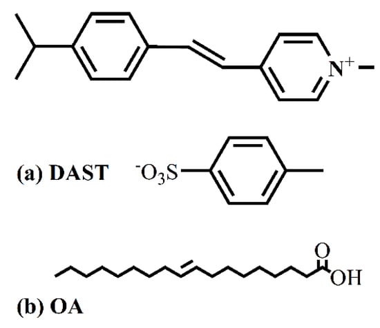 Molecular structures of (a) DAST and (b) OA, respectively.