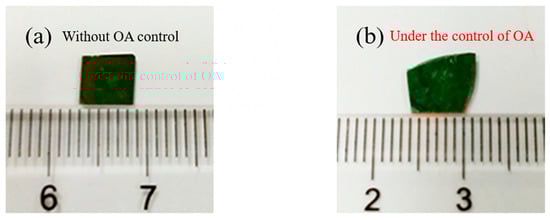 The molecular structures of DAST and the OA additive are shown schematically in Figure 1a,b, respectively. As a comparison, Figure 2 shows the photographs of the largest DAST single crystals grown with and without the OA control. One can see that without the OA control, a crystal with a size of 5.8 × 5.5 × 0.9 mm3 was yielded (Figure 2a), where the growth rates along the a- and b-axes are almost the same, but the growth rate along the c-axis is relatively slow. In contrast, the largest DAST crystal grown under the control of the OA over the same time has a relatively larger size of 11 × 8 × 1.2 mm3, as shown in Figure 2b. It is worth noting that compared with the typical DAST crystal grown without the OA control (Figure 2a), the morphology of the DAST crystal grown under the control of the OA is of an irregular hexagonal shape rather than a square platelet, but both crystals have the same crystal plane of (001) as the largest area. We note that the morphologies of the DAST single crystals grown under the control of the OA by the slow-cooling method as in this work are similar with those previously grown by the solvent evaporation method []. For the growth of DAST crystal under the control of the OA, the (010) face of DAST emerges since the oxygen atoms are exposed to the solution and OA for the (010) face, thus causing the formation of hydrogen bonds between the hydroxyl group of OA and the oxygen of DAST anions []. Interestingly, the OA addition inhibits the complete growth of the (010) face of DAST [], and consequently, the crystal with an irregular hexagonal shape is observed in this case. As a result, the growth rate along the b-axis was inhibited, thus leading to the growth rate being slower along the b-axis than that along the a-axis in the OA case. Moreover, Figure 2 reveals that both growth rates along the a- and b-axis are higher in the crystal grown under the control of the OA than those in the crystal grown without the OA control. It is worth noting that the sizes of both DAST single crystals grown with (11 × 8 × 1.2 mm3) and without (5.8 × 5.5 × 0.9 mm3) the control of the OA by the slow-cooling method as in this work are significantly larger than those (6 × 3 × 1 mm3 and 3 × 1.5 × 0.5 mm3, respectively) previously grown by the solvent evaporation method [].