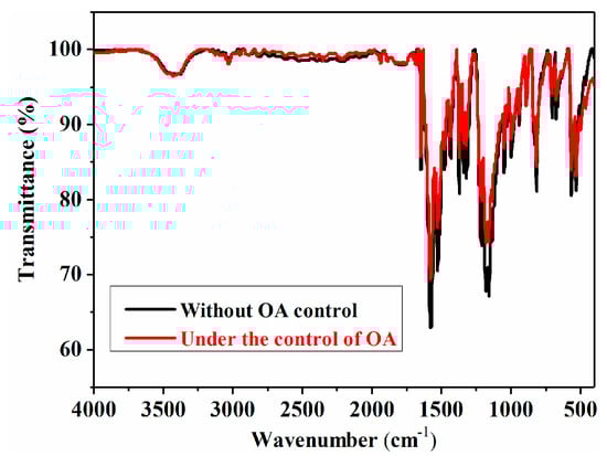 The characterization of the products by mid-infrared (MIR) spectroscopy provides further chemical information. The typical MIR spectra in the wavenumber range of 4000−400 cm−1 for the DAST crystals grown with and without the OA control are shown in Figure 3. The characteristic MIR peaks in these spectra are assigned as: aromatic C-H stretching mode at 3033 cm−1, C=C stretching mode of vibrations at 1642 cm−1, aromatic ring vibrations at 1580 and 1527 cm−1, CH3 bending absorption mode and C-N stretching mode at 1373 cm−1, SO3− symmetric stretching vibration at 1171 cm−1, 1,4-distribution in the aromatic ring at 820 cm−1. The absorptions in the wavenumber range from 500 to 1000 cm−1 are attributed to the substituent group of the aromatic ring vibrations [,]. It is clear that the DAST crystal grown under the control of the OA exhibits similar IR features like that of the DAST crystal grown without the OA control (Figure 3), both of which are in accordance with those previously reported about DAST single crystals []. This indicates that both DAST crystals grown with and without the OA control have the same chemical structures. In other words, the OA additive has not been significantly incorporated into the as-grown DAST single crystals.