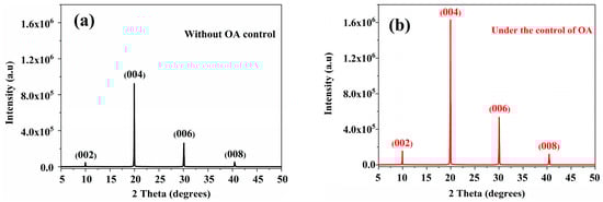 The X-ray diffraction (XRD) spectra of the DAST crystals grown with and without the OA control are shown in Figure 4. Both major peaks were detected at 10°, 20°, 30°, and 40°, corresponding to the (002), (004), (006), and (008) planes of the DAST with the monoclinic space group Cc [,,]. No additional peaks are observed in the range of 5–50°, verifying that OA neither changes the monoclinic crystal structure of the DAST nor induces polymorphism. Moreover, their narrow full widths at half maximum (FWHM) and strong intensities are indicative of excellent crystallinity []. The values of FWHM can be further utilized to calculate the average grain sizes through the Scherrer equation [], by which both sizes for the DAST single crystals grown with and without the OA control were estimated to be similarly about 90 nm. It should be noted that the peak intensities of the DAST grown under the control of the OA at (002), (004), (006), and (008) face are 3.45, 1.76, 2.03, and 2.28 times greater than those of the DAST grown without the OA control, respectively (Figure 4). This suggests that the existence of OA during the growth progress improves the crystallinity of the DAST single crystals.