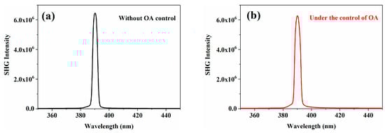 A femtosecond pulse laser was launched into the DAST crystals grown with and without the OA control, and the resulting SHG signals were collected using a microscope and detected by a spectrometer (SP 2500i, Teledyne Acton Optics, Acton, MA, USA). The related results in Figure 5 show that strong SHG signals have been measured from both the DAST crystals, and importantly, the optical nonlinearity of the DAST crystal grown under the control of the OA is similar with that conventionally grown without the OA, consistent with the crystallography observation from the XRD measurements (Figure 4).