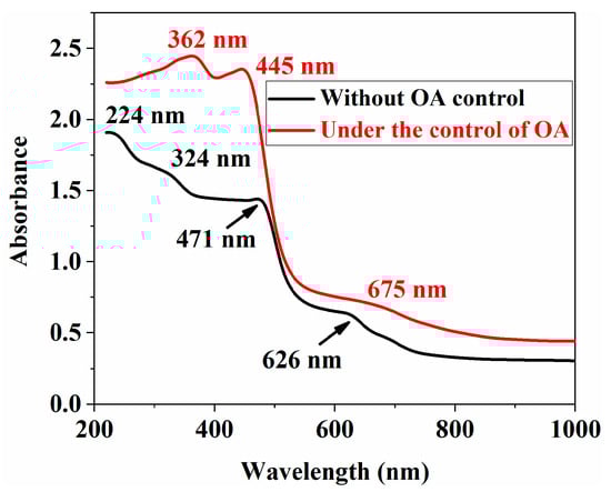 The crystals were further characterized by UV-vis spectroscopy to investigate the influences of the OA additive on the optical properties of the as-grown DAST crystals. The absorption spectra of the DAST grown with and without the OA control are depicted in Figure 6. The absorption spectrum of the DAST crystal grown without the OA control by the slow-cooling method as in this work exhibits some subtle differences from those previously grown by the slow solvent evaporation method []. This is not entirely a surprise since different growth methods lead to different absorption peaks of the products, due to different preparations, interfaces, surface conditions, and imperfections. In our work, the DAST single crystals were grown with and without the OA control by the slow-cooling method under otherwise the same conditions. Further inspection indicates that the absorption spectrum of the DAST crystal grown without the OA control changes more gently with the wavelength (Figure 6). In contrast, the DAST grown under the control of the OA exhibits a stronger and more clearly discernable absorption edge (Figure 6). It should be noted that compared with the DAST single crystals grown without the OA control, less absorption peaks were measured from the DAST single crystals grown under the control of the OA (Figure 6), further indicating higher crystallinity for the latter case, as suggested by the XRD results (Figure 4).