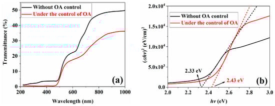 According to the UV-vis measurement results (Figure 6), the optical absorption coefficient can be further determined from the transmittance data (Figure 7a), using the following relation []: