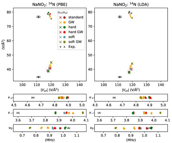 EFG plots for the 14N site in NaNO2, utilizing both PBE (left) and LDA (right) functionals are shown at the top; the corresponding NQR frequencies are shown underneath. Colored markers show a computed value for each PAW potential. Experimental data [39,46], shown in black, is close to calculated results, . The and components were computed to be positive and negative.