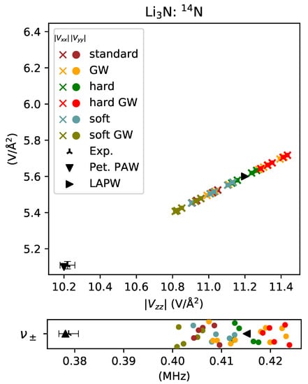 EFG plot for the 14N sites in Li3N are shown at the top; the corresponding NQR frequencies are shown underneath. Since the system is symmetric, , only one frequency exists. Colored markers show a computed value for each PAW potential. Experimental data [40], shown as a three-pointed star, is close to these values, , but lies outside their range. Literature data [16], shown in black, were calculated using both a PAW and LAPW method. The value was computed to be positive.