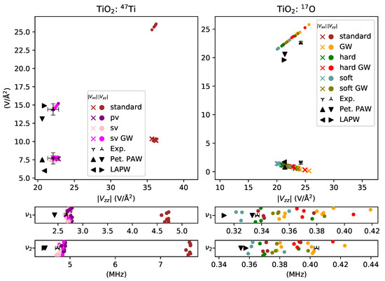 EFG plots for 47Ti and 17O in TiO2 are shown at the top; the corresponding NQR frequencies are shown underneath. Colored markers show a computed value for each PAW potential. Literature data [16], shown in black, were calculated using both a PAW and LAPW method. Experimental data [45] is shown as a three-pointed star. The and values were computed to be positive and the negative for the titanium site. Following experimental data, is negative for the oxygen site, while the other components are positive. As was done by Petrilli et al. [16], the EFG tensor was chosen to match the experimental orientation, which meant that for the calculated values.