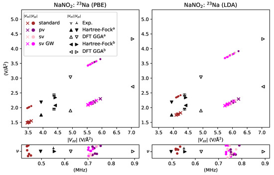 EFG plots for the 23Na site in NaNO2, utilizing both PBE (left) and LDA (right) functionals, are shown at the top; the corresponding NQR frequencies are shown underneath. Colored markers show a computed value for each PAW potential. Experimental data [43] is shown as a three-pointed star and fell between the computed values. Available literature data [30], shown in black, were calculated with Hartree–Fock and DFT using linear combinations of atomic orbitals (LCAO) as a basis set, with superscript a = [8-511/8-41/8-411] and b = 6-21G. The and components were computed to be positive and negative.