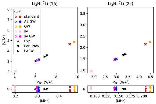 EFG plots for both 7Li sites, denoted by their Wychoff positions, in Li3N are shown at the top; the corresponding NQR frequencies are shown underneath. Colored markers show a computed value for each PAW potential and experimental data [40] is shown as a three-pointed star. The potential with the best agreement to experiment is sv GW, with , and the worst being the GW potential with . Literature data [16], shown in black, were calculated using both a PAW and LAPW method. The value is computed to be negative for the 1b site and positive for the 2c site.