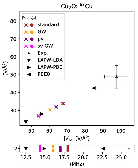 EFG plot for 63Cu in Cu2O is shown at the top; the corresponding NQR frequency is shown underneath. The system is symmetric, hence . Colored markers show a computed value for each PAW potential and experimental data [49] is shown as a three-pointed star. The potential closest in agreement to experiment is the standard potential and was found to be off by and the furthest potential is sv GW, off by . Literature DFT data [29], shown in black, were calculated using an LAPW method with different exchange-correlation energy functionals. The value was computed to be negative.