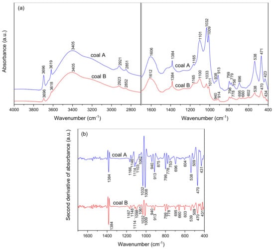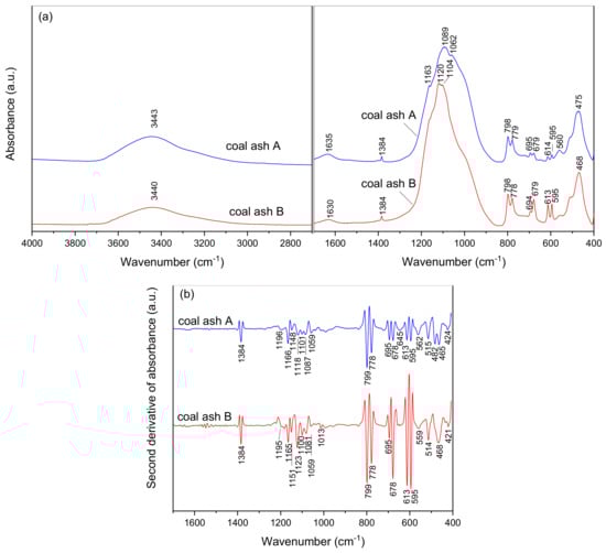 FTIR spectra of coal ashes: (a) Original spectra and (b) second-derivative spectra.