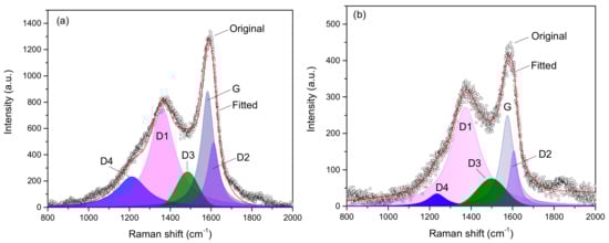 Figure 3 presents the Raman bands of coals. Although the infrared spectra show marked absorption bands of minerals in coals (see Figure 1), the Raman spectra of coals indicate intense bands of disordered carbon but no bands of mineral matter. This is because Raman spectroscopy is very sensitive to carbonaceous materials, the unburned carbon in coal ash can even be readily detected [25,33]. The prominent carbon bands near 1350 and 1590 cm−1 are D and G bands, respectively. The original Raman spectra of coals were resolved into five peaks according to the literature [17], i.e., four Lorentzian peaks (D4, D1, G, and D2 bands) and one Gaussian peak (D3 band). Initial peak positions were defined at 1150, 1350, 1520, 1590, and 1620 cm−1 for D4, D1, D3, G, and D2 bands, respectively. The band positions and ratio of peak areas (ID1/IG, ID1/IAll, and IG/IAll) are given in Table 4. The five individual peaks in Figure 3 were associated with different carbonaceous structure and detailed interpretation can be found in the literature [17]. The value of ID1/IG is usually related to the degree of order and the lower value of ID1/IG denotes the more ordered structure [17]. Thus, Table 4 shows that the degree of order of coal A was slightly higher than that of coal B.