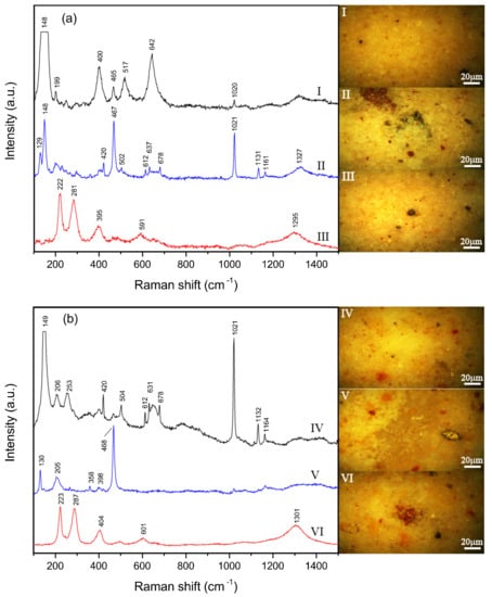 Typical Raman spectra and micrograph for coal ashes: (a) Coal ash A and (b) coal ash B. Typical components are: I—anatase, quartz, and anhydrite; II—quartz, anatase, and anhydrite; III—hematite; IV—anatase, quartz, and anhydrite; V—quartz; and VI—hematite.