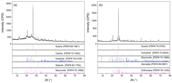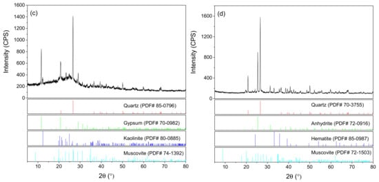 The XRD results of coals and coal ashes and patterns of standard diffraction data are shown in Figure 5. Due to relatively abundant mineral matter in raw coals, the diffraction peaks of crystalline carbon such as (002) peak were obscured by the mineral peaks. The mineral components in coal A were primarily quartz, calcite, kaolinite, siderite, and muscovite. The main minerals in coal B were quartz, gypsum, kaolinite, and muscovite. The broad diffraction feature in the low-angle region in Figure 5a,c suggests the presence of amorphous clay minerals in raw coals. The occurrence of anhydrite in coal ash A was due to the decomposition of CaCO3 and the reaction between newly formed lime and sulfur oxides released from organic sulfur combustion. The presence of anhydrite in coal ash B accounted for the partial dehydration of gypsum and further dehydration of bassanite upon heat treatment [46]. These results were consistent with FTIR analyses, as described above. The structure of muscovite changed progressively and continuously with temperatures [47]. A previous study [48] shows that the destruction of muscovite lattices occurs at 940–980 °C. Thus, the muscovite remains in both coal ashes. Figure 5 shows the disappearance of kaolinite in both coal ashes, which agreed well with the results of FTIR. Figure 5b,d did not show the diffraction peaks of metakaolinite due to its low crystallinity, which is supported by the literature [34]. The XRD analyses were generally consistent with the results of FTIR and Raman spectra.