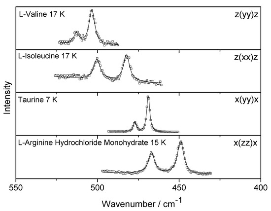 Additionally, a few amino acids were investigated as function of temperature in search of polymorphic crystalline phases using the Raman spectroscopy technique. On one hand, for L-valine, taurine, and L-arginine hydrochloride monohydrate, crystals with monoclinic structure, evidences of phase transitions were obtained [7,8,9]. On the other hand, for the monoclinic crystals of L-isoleucine, no evidence of a structural phase transition was found [10].