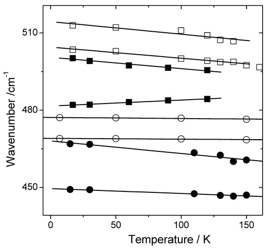 Linear fitting for wavenumber thermal evolution of the of Raman bands associated with NH3+ torsional vibration. L-valine (□), L-isoleucine (▪), taurine (◦) and L-arginine hydrochloride monohydrate (●) crystals.