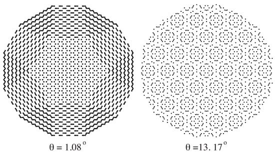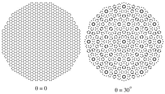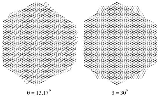 As shown in Figure 2, if , both vector sets collapse and three vectors pointing to the vertices of a triangle are obtained. If , six vectors pointing to six vectors of a dodecagon are obtained instead. Consequently, with linear integer combinations of the vectors in Equation (6), two hexagonal lattices rotated by can be generated.