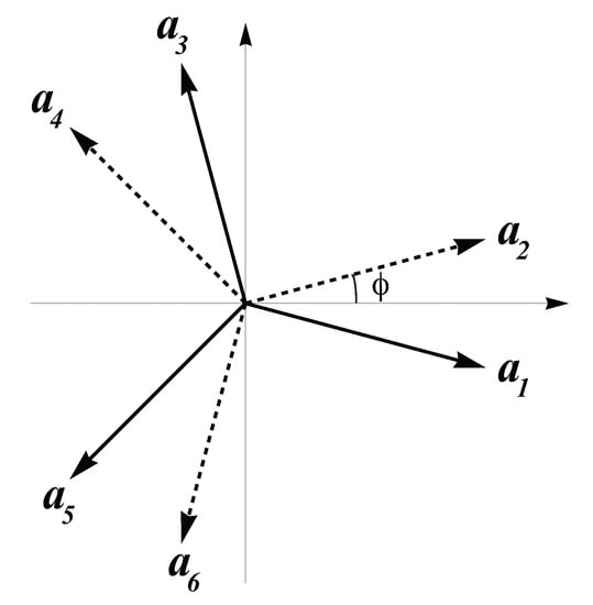 The existence of is guaranteed if the set forms a eutactic star [25,26]. The orthogonal projection of a set of orthogonal vectors in onto a two-dimensional space is called a eutactic star; if the vectors in are orthonormal, the projection is called a normalized eutactic star. In other words, if the set forms a normalized eutactic star, then there exists a projector such that Equation (3) is fulfilled and actually: