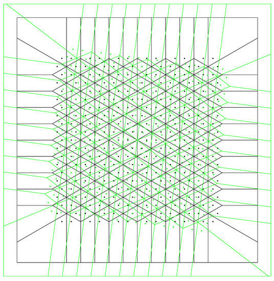 It should be stressed that, in our case, the hexagonal lattice and the honeycomb are dual to each other, that is the Voronoi tesselation of the honeycomb is the hexagonal lattice and vice versa. In Figure 3, two honeycomb structures rotated in between are shown with black and green points, respectively; the Voronoi tessellation associated to each lattice is also displayed in green and black lines. According to the procedure described above, we should look for neighbouring points, that is, where two points (one black and the other green) are both contained in the intersection of their respective Voronoi polyhedra. Neighbors points are then replaced by a point of good fit located at the middle.