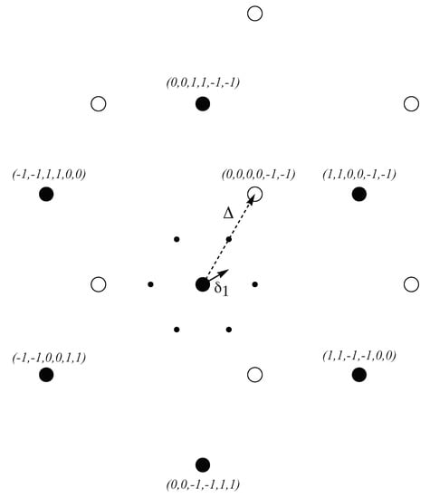 From this equation, we can verify that the vectors , , , and belong to (thus ), which together with the vectors in Equation (11) form a central hexagon (large disks in Figure 4). The distance from the vertices to the incenter of this hexagon is 2, which is larger than the hexagon generated by the standard basis vectors of that are project onto Equation (6) and shown with small disks in Figure 4. Therefore, linear integer combinations of the vectors , , , and generate the first hexagonal lattice, say A, which lie in , that is, the distance d of all its points is 0. Now, we now should obtain a second hexagonal lattice B, displaced by a vector (dashed arrow in Figure 4). As in the case of in Equation (10), the magnitude of is obtained as