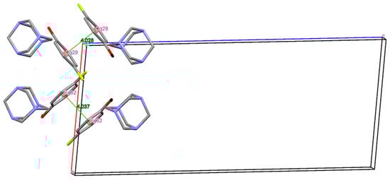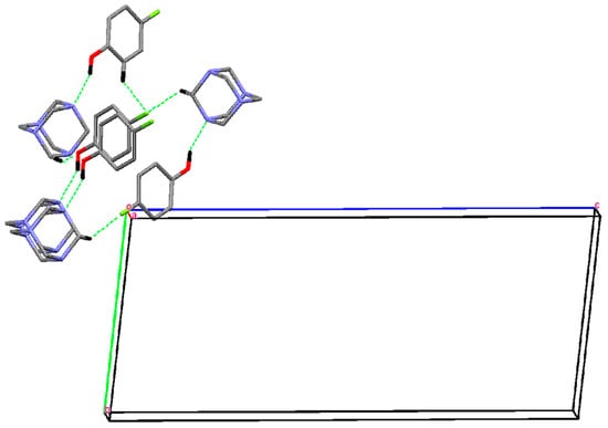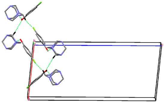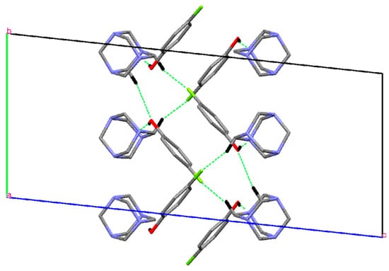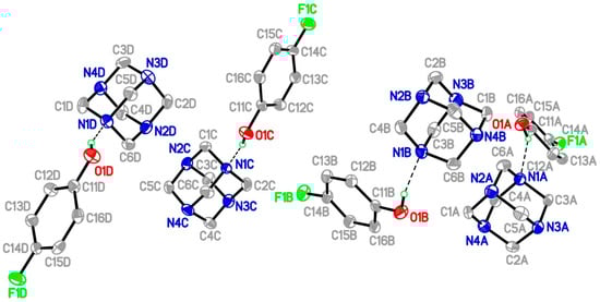 As indicated in PLATON [31], the crystal structure features four O−H···N hydrogen bonds (Table 3). These bonds occur such that each molecule of HMTA links one 4-FP molecule to form four two-molecule aggregates, as illustrated in Figure 1. These aggregates are connected into a three-dimensional architecture by a large number of C−H···X interactions (X = F, O and N).