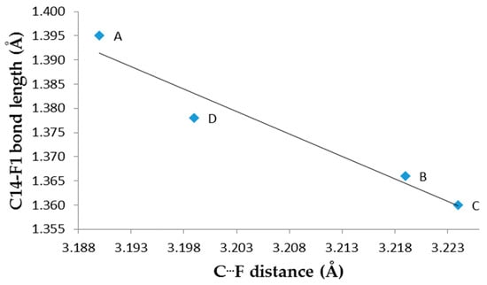Compared to the F−C bond length of 1.361 Å in 4-fluorophenol, as stated before, we believe that the intermolecular C−H···F−C hydrogen bonding interaction is the key to the observed structural changes, especially the observation of these elongated F−C bonds, which include the F1A−C14A, F1C−C14C, F1A−C14A, and F1D−C14D bonds. The plot of F−C bond length versus C···F distance is shown in Figure 6. The F−C bond length almost linearly increases with decreasing donor–acceptor distance (C···F distance). The presence of two C−H···F hydrogen bond interactions in F1 made the F−C distance notably longer. Thus, the F1A atom is distinct from the F1(B–D) atoms based on the number of interactions it forms.