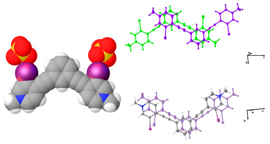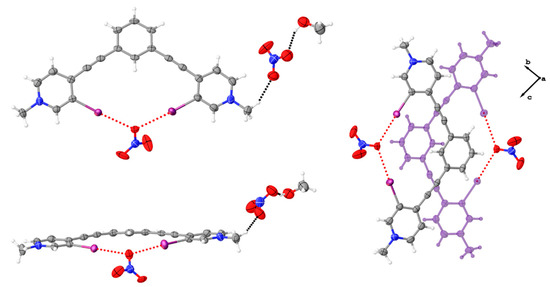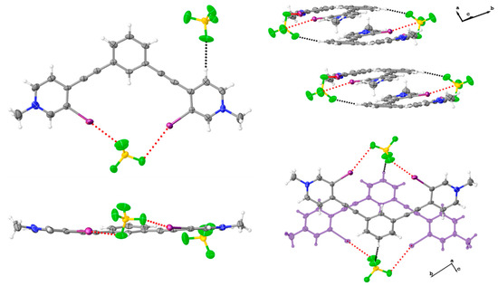 In our 1,3-bis(4-ethynyl-3-iodopyridinium)-benzene systems, two types of antiparallel dimers are frequently observed; centered and off-centered. The centered antiparallel dimer, shown in 1 and 3•MeOH (Figure 1 and Figure 5), is primarily observed in structures adopting the bidentate conformation. The one exception is an S conformation with the thiocyanate anion dichloromethane solvate structure that exhibits both centered and off-centered antiparallel dimers [38].