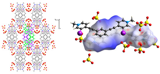 We have identified the packing tendencies of these receptors, yet an alternative explanation for the regularity of dimers could be attributed to molecular shape and close-packing, inspired by the classic concepts and ideas of Kitaigorodskii [59,60]. These 1,3-bis(4-ethynyl-pyridinium)-benzene receptors are planar, rigid, and directional tectons, which limit efficient packing arrangements and increase the probability of dimer formation. If the dicationic receptor geometry influences dimer formation, other cationic arylethynyl systems should exhibit similar packing features.
