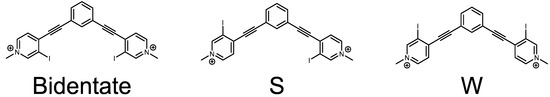 Arylethynyl scaffolds have been successfully used in various supramolecular chemistry fields, including coordination complexes and host-guest systems [33,34,35]. The rigidity and directionality afforded by the alkyne bond makes it a favorable structure to build upon. Although directional, alkynes exhibit conformational flexibility due to their low rotational barrier. For example, our 1,3-bis(4-ethynyl-3-iodopyridinium)-benzene system readily adopts three planar conformations as shown in Scheme 1. Inspired by the rich history of these systems, and our interest in halogen bonding, we combined the two to produce the first bis-ethynyl bidentate pyridinium halogen bonding receptors [36].