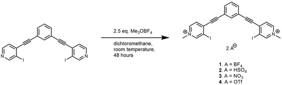 The synthesis of 1,3-bis(4-ethynyl-3-iodopyridinium)-benzene scaffolds and the neutral parent compounds have been previously reported [36]. 1 was synthesized with a small modification as methylation of the neutral species was carried out using trimethyloxonium tetrafluoroborate rather than methyl triflate (Scheme 2). The crystal structure of 2 was produced by adding tetra-n-butylammonium nitrate to a solution of 1. Similarly, 3 was produced by adding tetra-n-butylammonium hydrogen sulfate to the previously reported 4 [36]. For individual crystal growth conditions see the Results and Discussion sections.